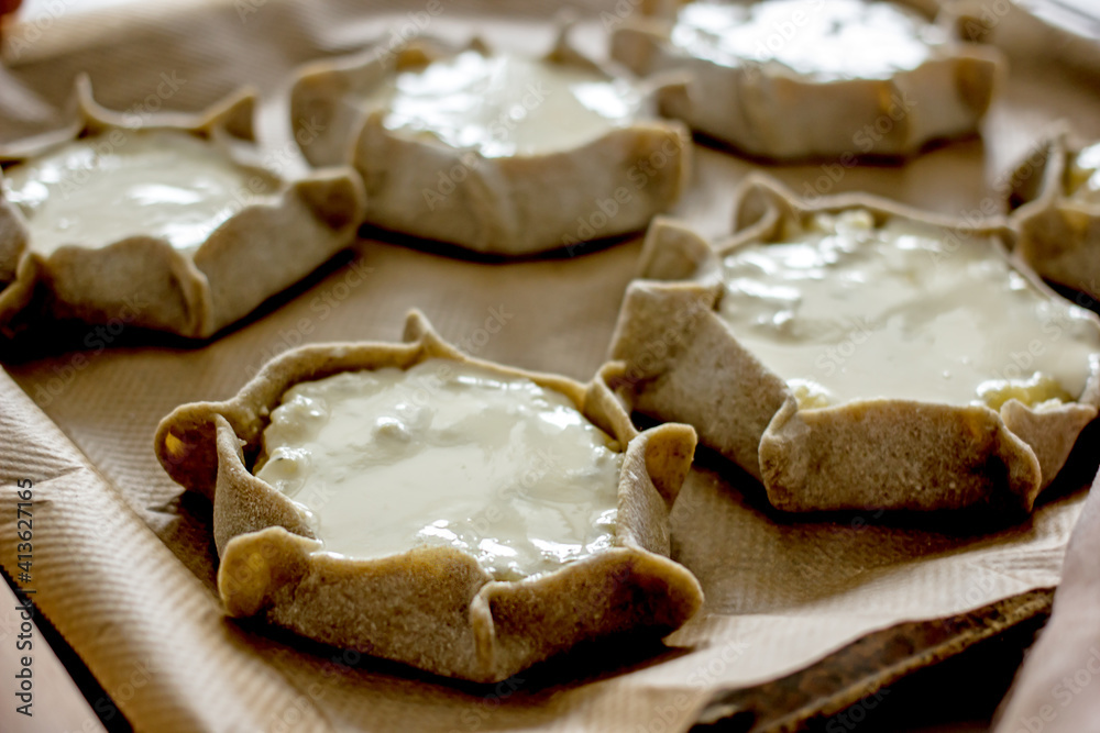 National Rye dough pies with potato filling. National Karelian food wicket close-up on on the baking dish. Alternative flour baked goods without sugar and gluten, authentic baked goods