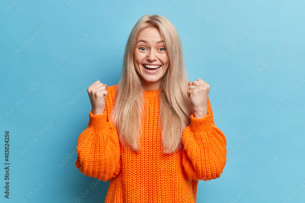 Euphoric overjoyed blonde woman celebrates success clenches fists with triumph screams from happiness cannot believe in victory dressed in orange knitted sweater isolated over blue background