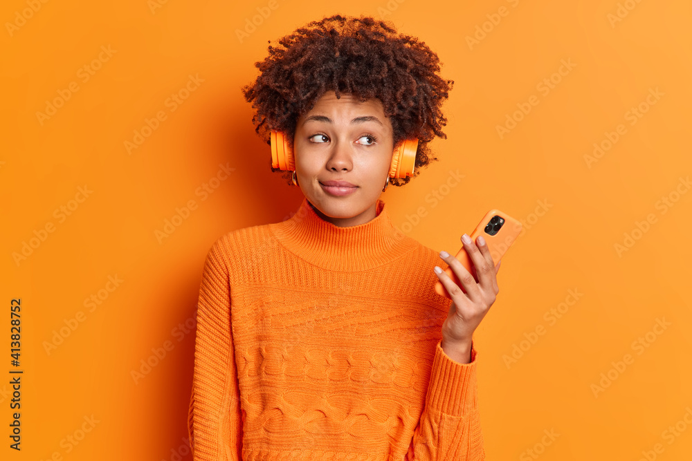 Thoughtful female meloman listens audio track from playlist holds modern smartphone looks pensively aside dressed casually isolated over orange background. People lifestyle entertainment concept
