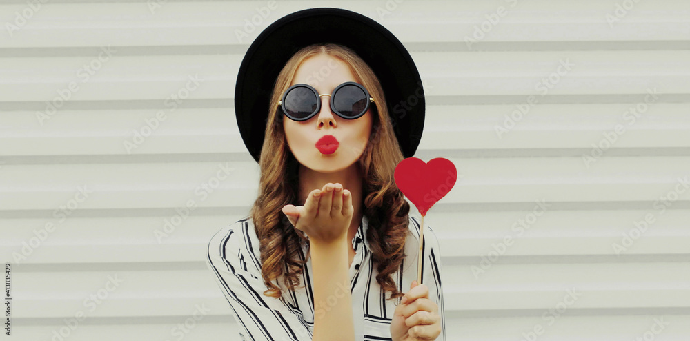 Portrait of beautiful young woman with red heart shaped lollipop blowing her red lips sending sweet air kiss on a white background
