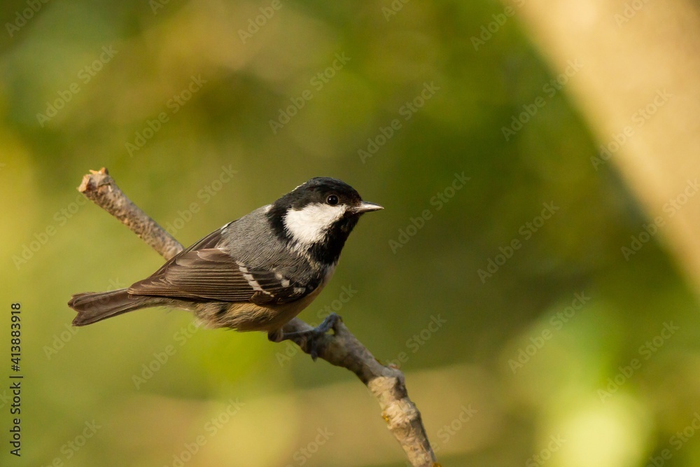Coal tit, Periparus ater, small bird on the branch with green background, selective focus