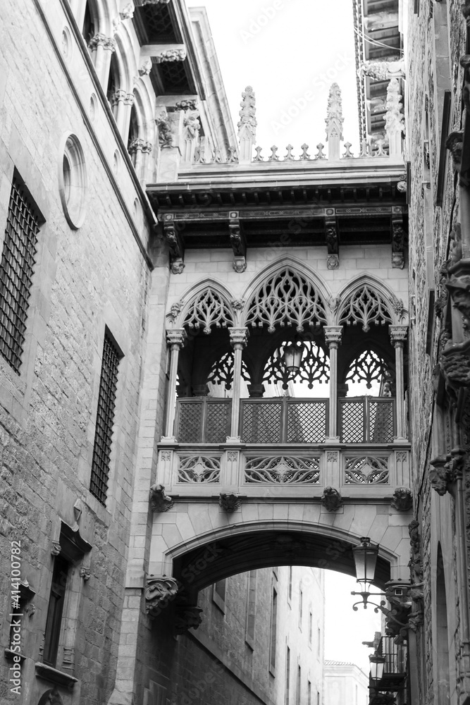 Gothic quarter of Barcelona, bridge covered with ornate in the old town, black and white photograph, selective focus