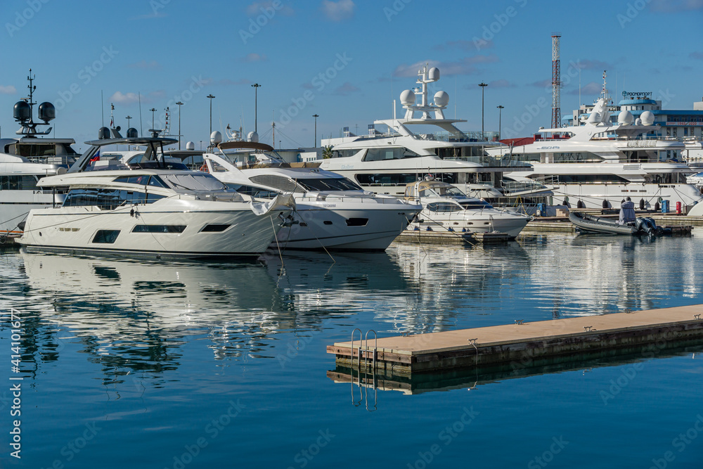 Ships, yachts and boats on blue surface of Black Sea by pier of Commercial seaport of Sochi. Resort city center. Sochi, Russia - November 23, 2020