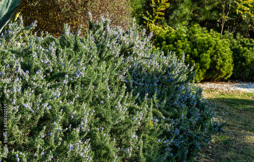 Blossoming rosemary plants (Rosmarinus officinalis or Salvia rosmarinus)on Olympic Embankment in Sirius, new village in Imereti lowland near resort Sochi. Selective close-up of fresh Rosemary