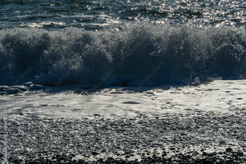 White wave breaking on Sochi Black Sea coast. White spray and foam in the foreground. Emerald blue sea water beyond. December winter sea in southern resort of Russia.