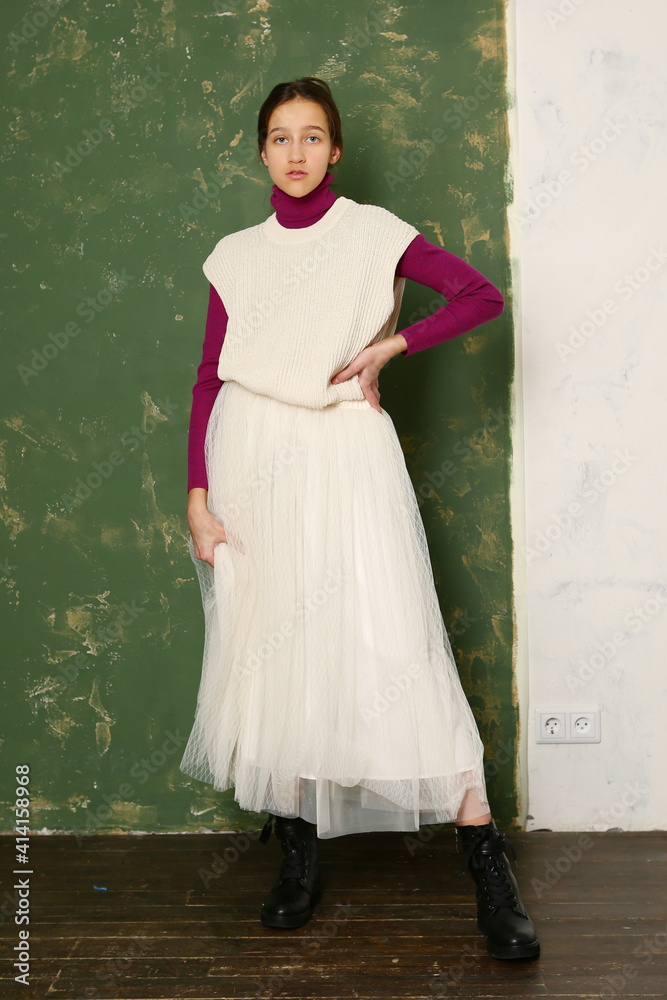 teenager girl ballet dancer in skirt and boots on green wall background