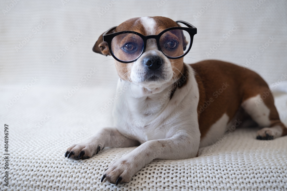 Small chihuahua dog in glasses looking at camera and lying on sofa.