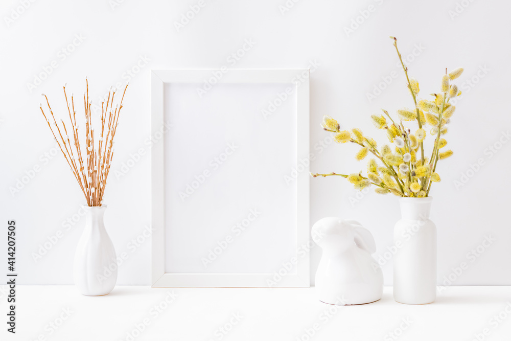 Home interior with easter decor. Mockup with a white frame and willow branches in a vase on a light background