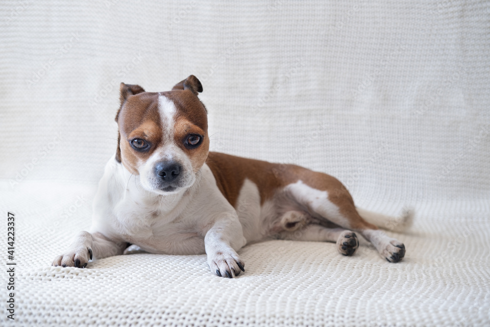 Small funny chihuahua dog looking at camera and lying on sofa.