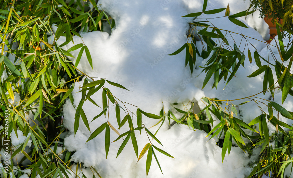 Original texture of natural evergreen leaves bamboo Phyllostachys aureosulcata with background of white snow. Nature concept for winter or spring design.
