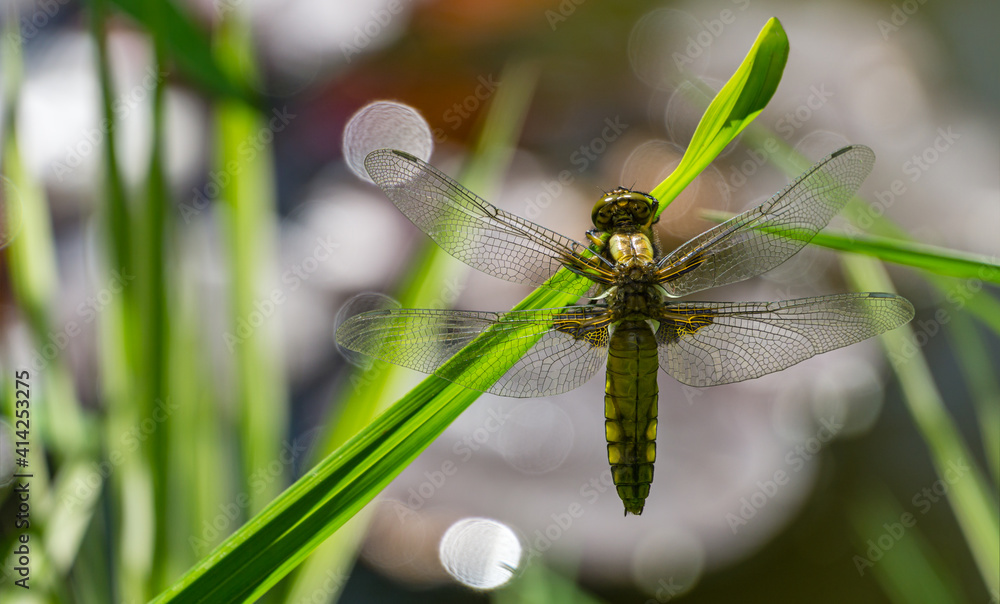 Close-up of Broad-bodied chaser dragonfly female (Libellula depressa) with large transparent wings and honey brown color body sitting on grass on blurred green garden pond background. Macro of insect.