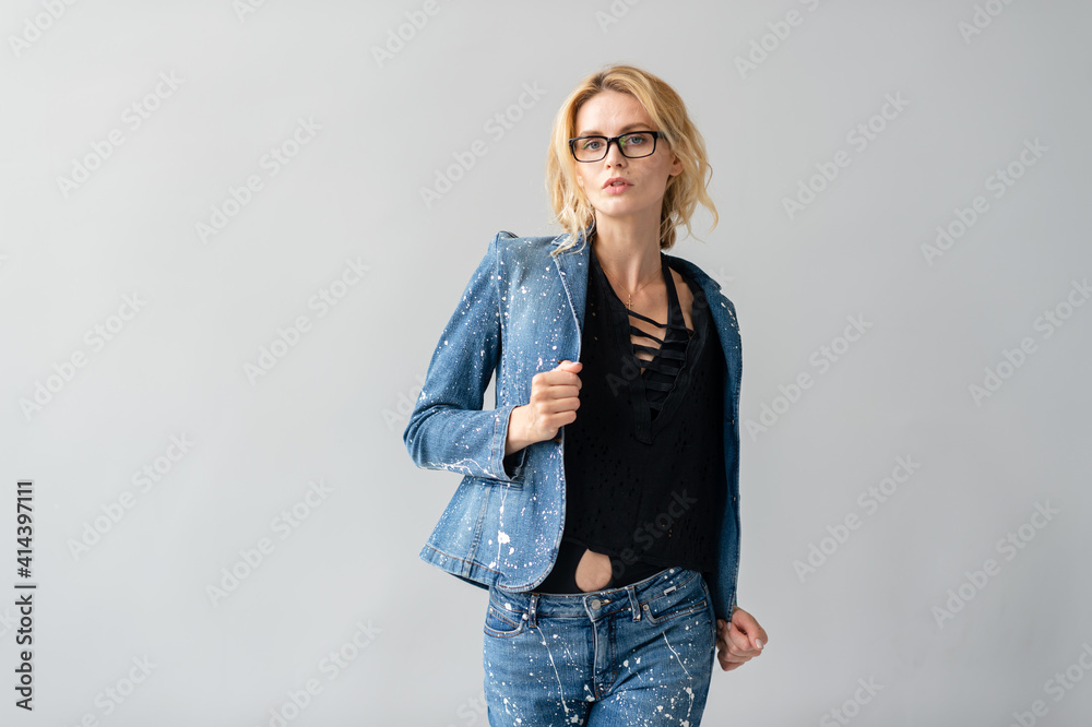 Beautiful stylish blonde model in jeans suit posing in studio