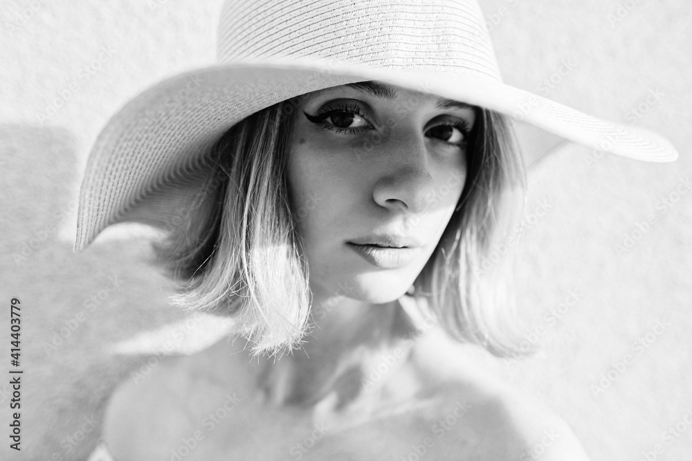 Close up portrait of elegant stylish blonde short hair girl in hat posing over white background