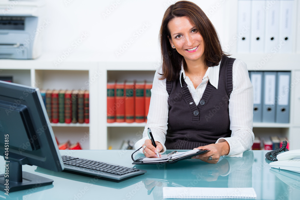 sekretärin sitzt am schreibtisch in trägt einen termin ein