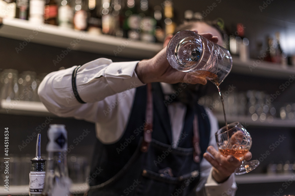 Barman in shirt and apron making an alcoholic drink with ice in a cocktail glass