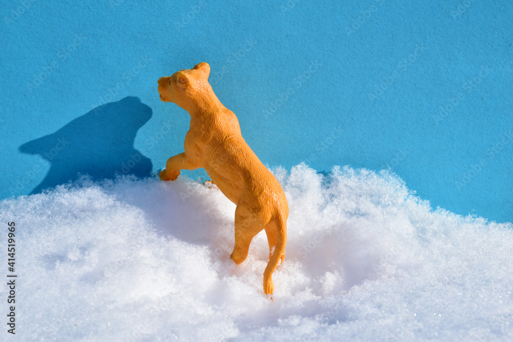 A yellow lioness stands with its front paws on a snowdrift.