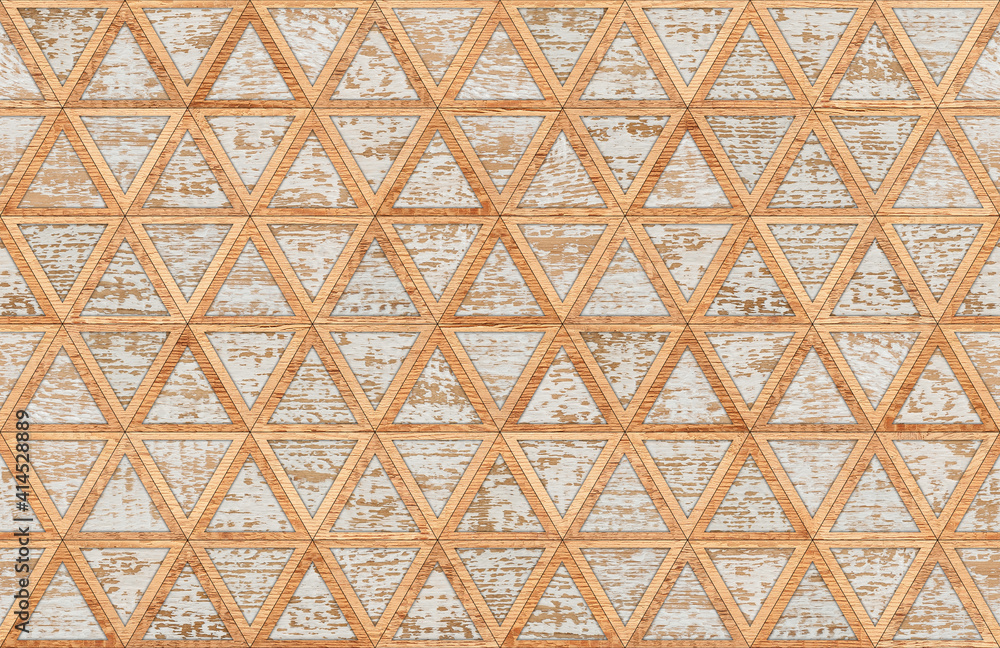 Shabby brown and white wooden wall with triangle pattern. Seamless light wooden background.