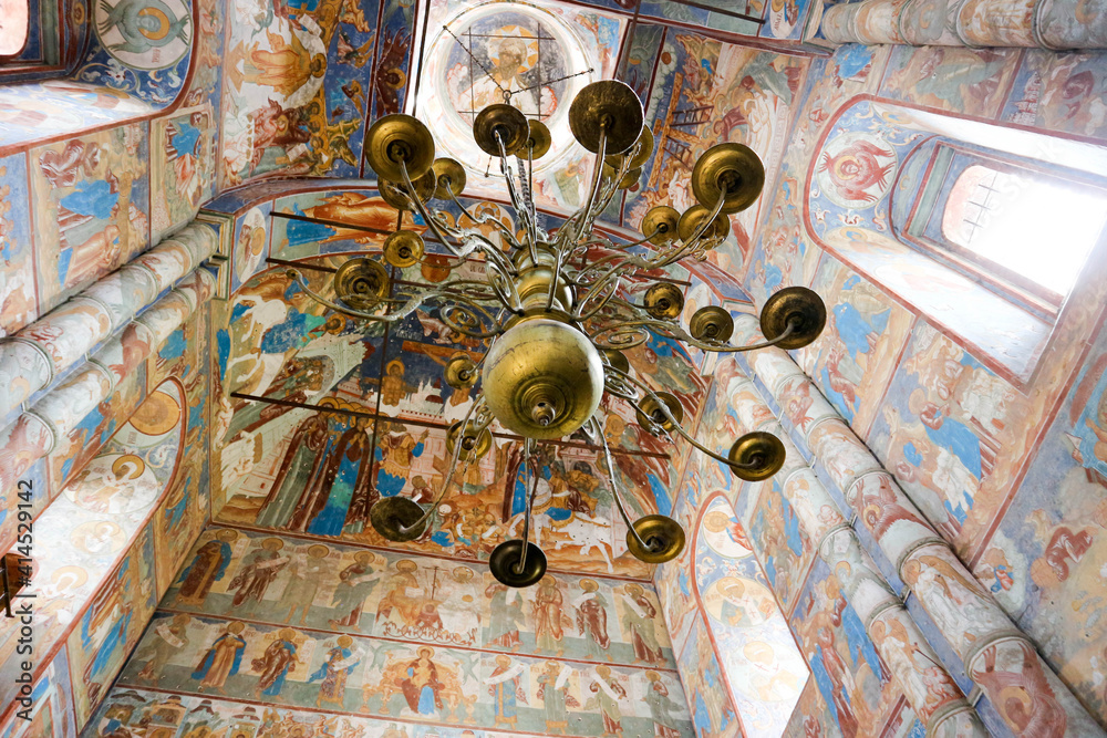 painted ceiling with old chandelier in interior of the orthodox church in Russia