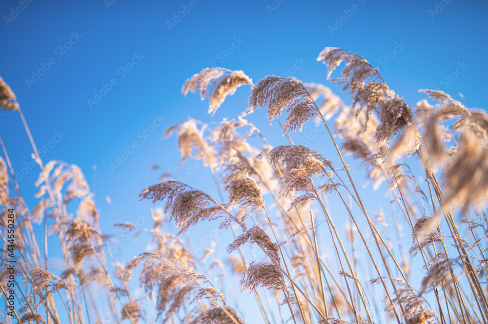 gefrorenes Schilfgras im Sonnenlicht vor blauem Himmel