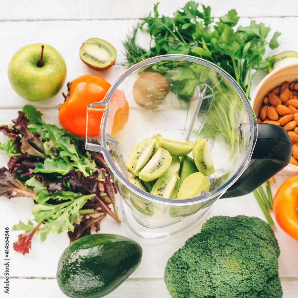 Ingredients for detox smoothies in a blender: apples, kiwi, avocado, persimmon, lettuce and parsley on wooden table