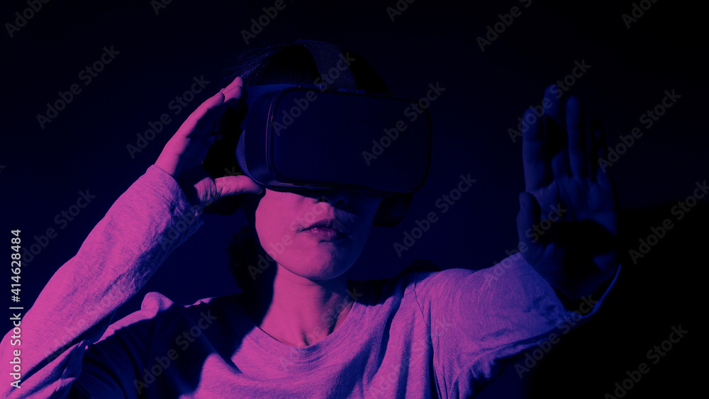Girl with hands up wearing the VR headset goggles. Asian woman in glasses of virtual reality. The concept of futuristic. Digital VR glasses. Woman getting cyber experience using modern black color VR.
