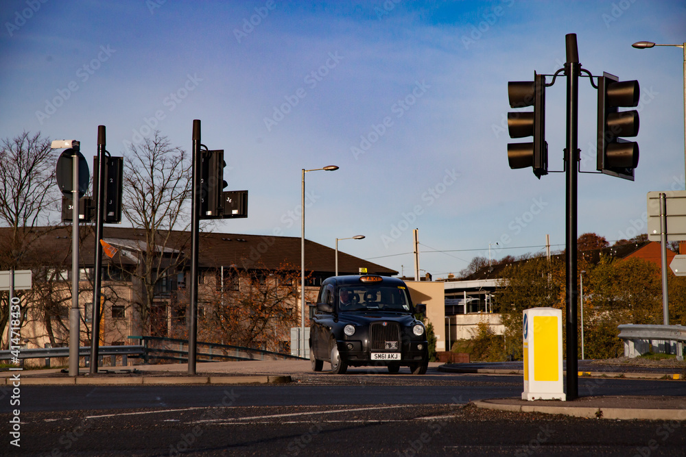 Glasgow, Scotland. Taxi car (London cab) crossing the road and traffic lights. Blue sky background.