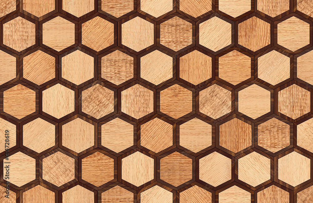 Brown hardwood parquet floor with hexagonal pattern. Wood texture background. Wooden tiles.