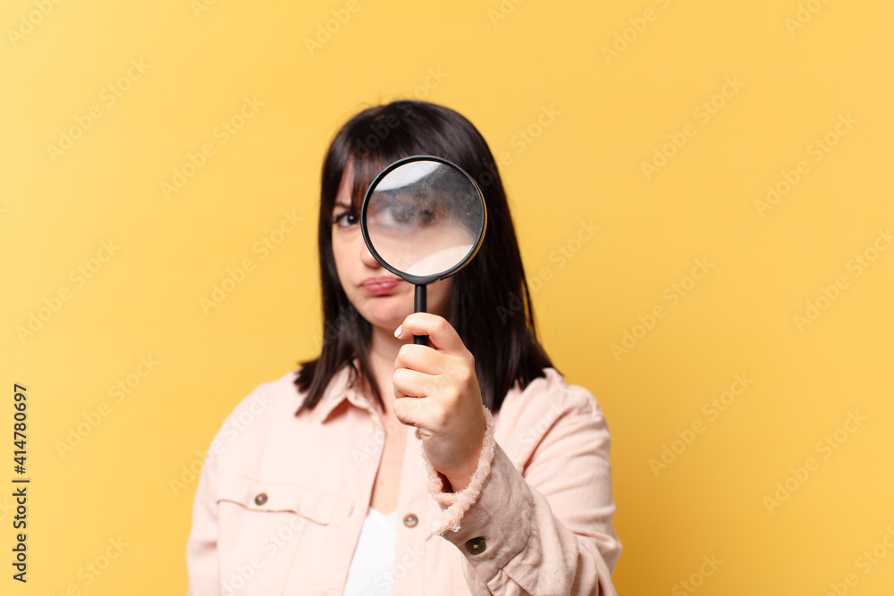 plus size pretty woman looking with a magnifying glass