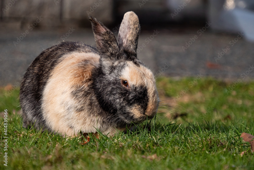 close up of a cute chubby spotted rabbit eating on green grass field in the park on a sunny day