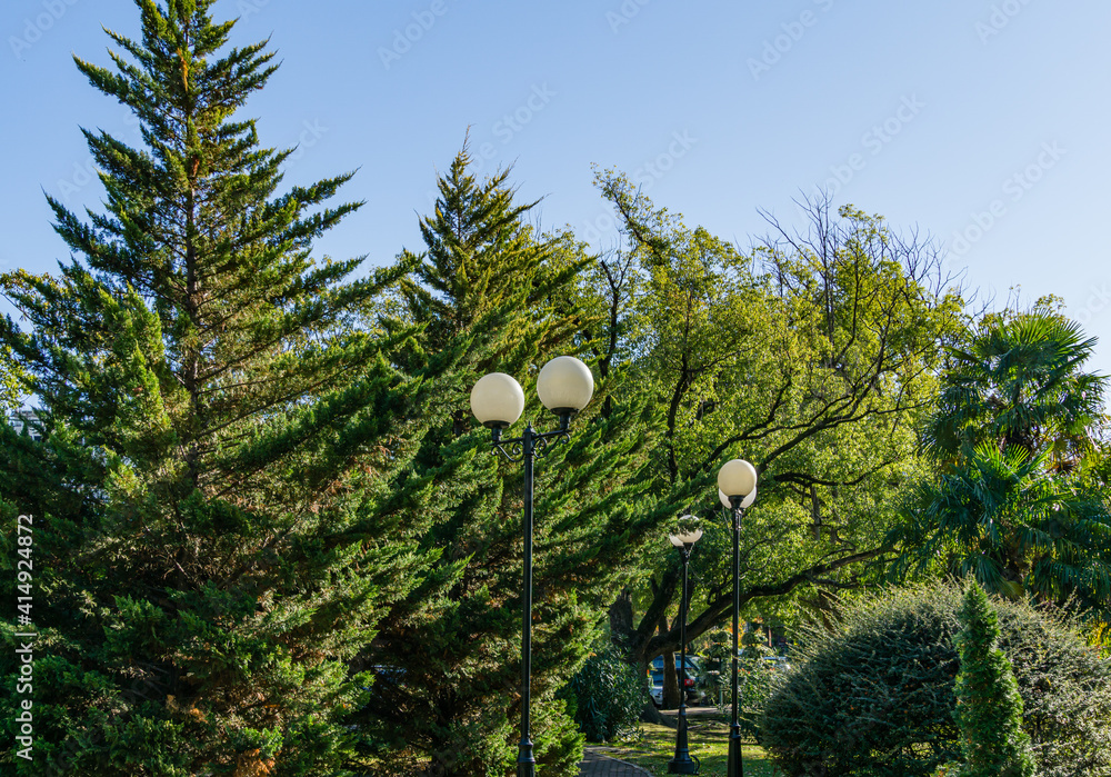 Big trees with lush vibrant green foliage of cupressocyparis Leylandii in city park Sochi. Famous resort town in south of Russia.