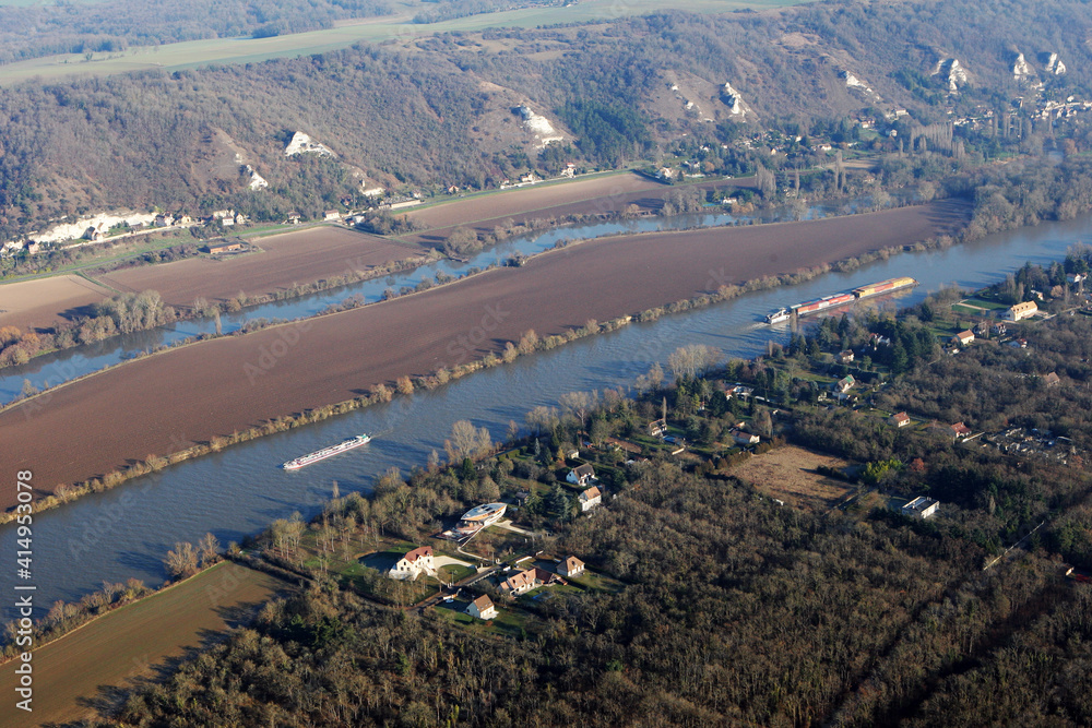 Barges and transport boats on the Seine river seen from the sky at Haute-Isle en Vexin