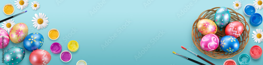Multicolored easter painted handmade eggs, paints and brushes. Festive Easter banner from eggs, paints and brushes on blue background with copy space for text