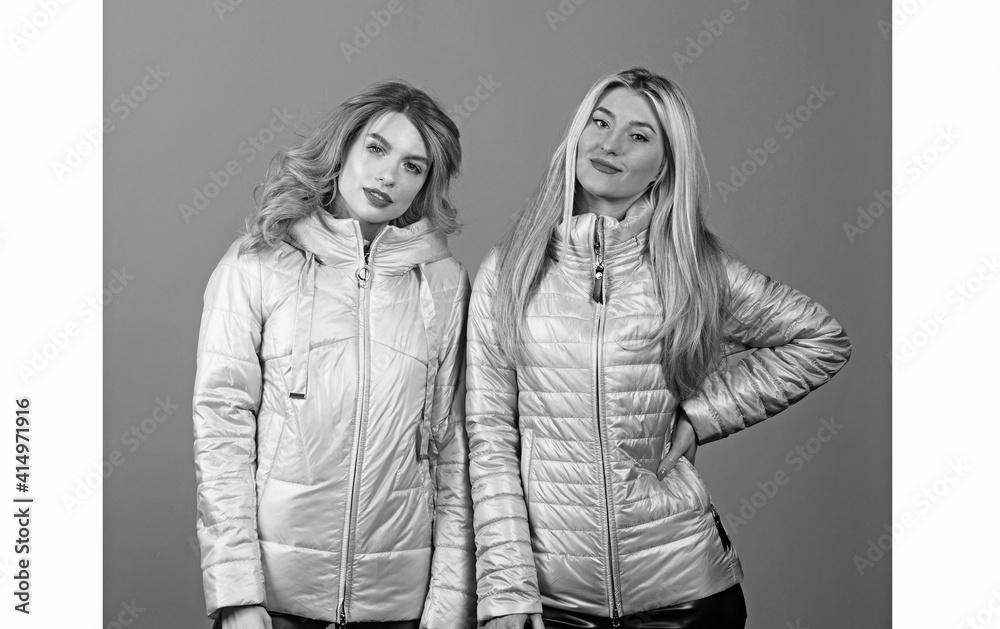 Two young beautiful blond smiling girls in trendy spring clothes. Positive models having fun.