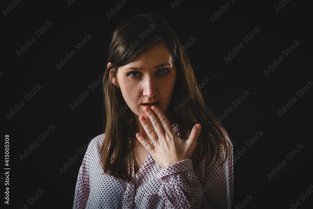 Oops sorry my fault. Portrait awkward guilty cute silly woman making mistake apologizing, cover hand mouth uncomfortable feeling, isolated black background worried