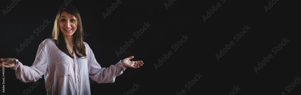 portrait of young surprised woman isolated on black wide background. Image of caucasian brunette woman wearing casual t-shirt shrugging and throwing up her hands isolated