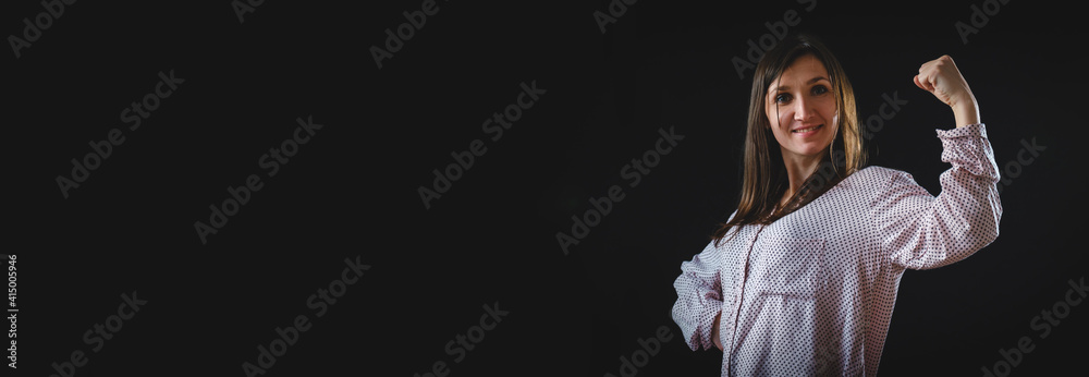 photo of pretty cheerful lady hold raise biceps hand arm show perfect biceps gym training strong powerful woman wear shirt isolated black background. Banner panorama