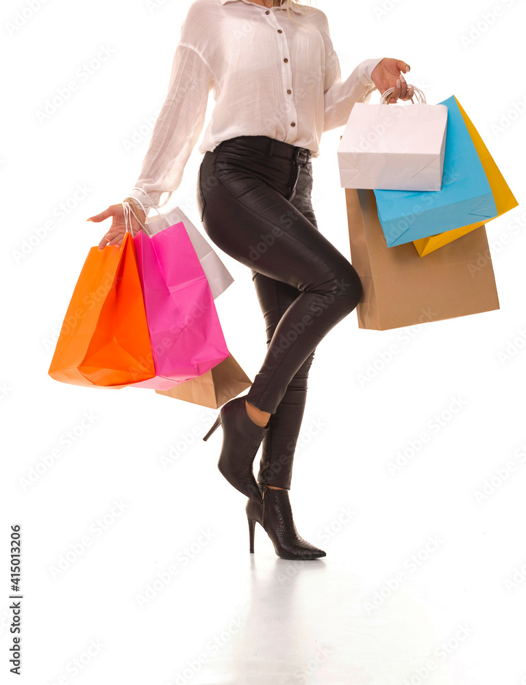 Young girl in high heels stands with purchases.