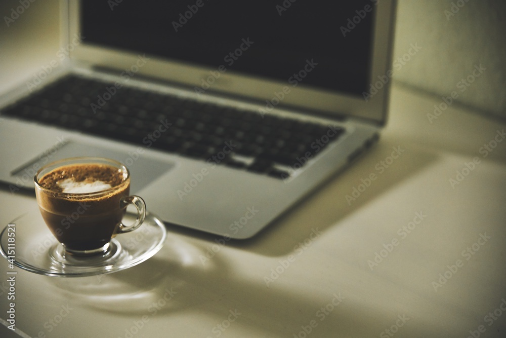 Tasse Espresso macchiato vor einem Laptop im Homeoffice