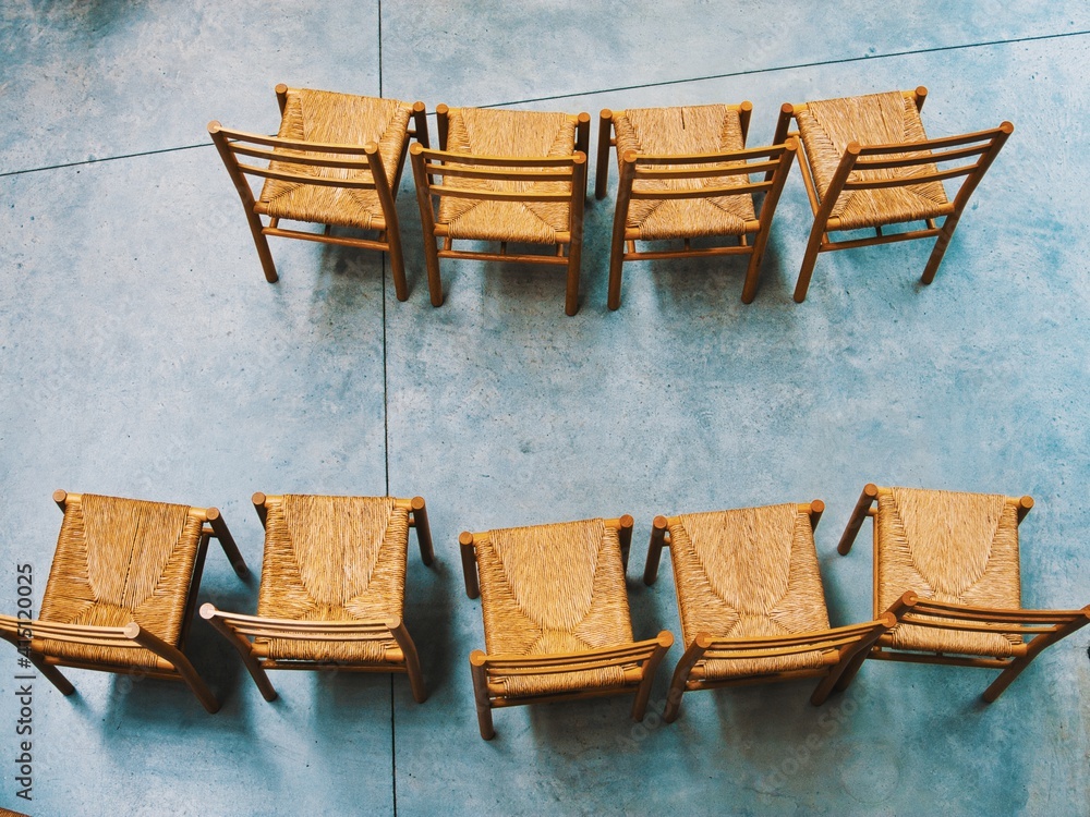 Zwei Reihen mit Korbstühlen auf Betonboden von oben betrachtet