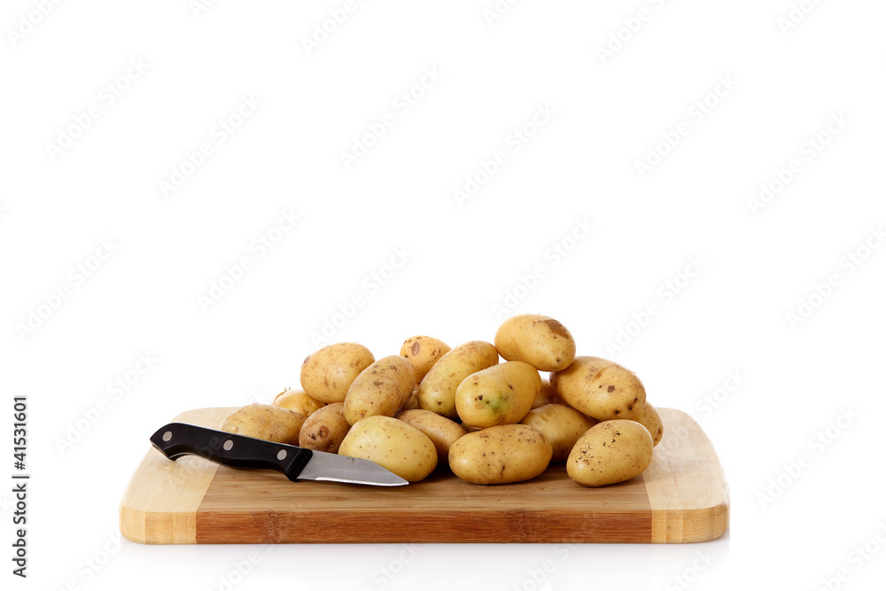 Fresh vegetables, potatoes, wooden chopping board.
