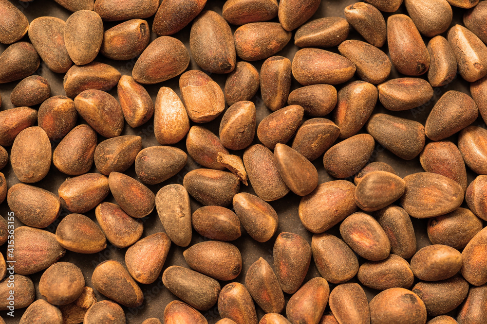 Background unpeeled Siberian pine nuts in a shell close-up.