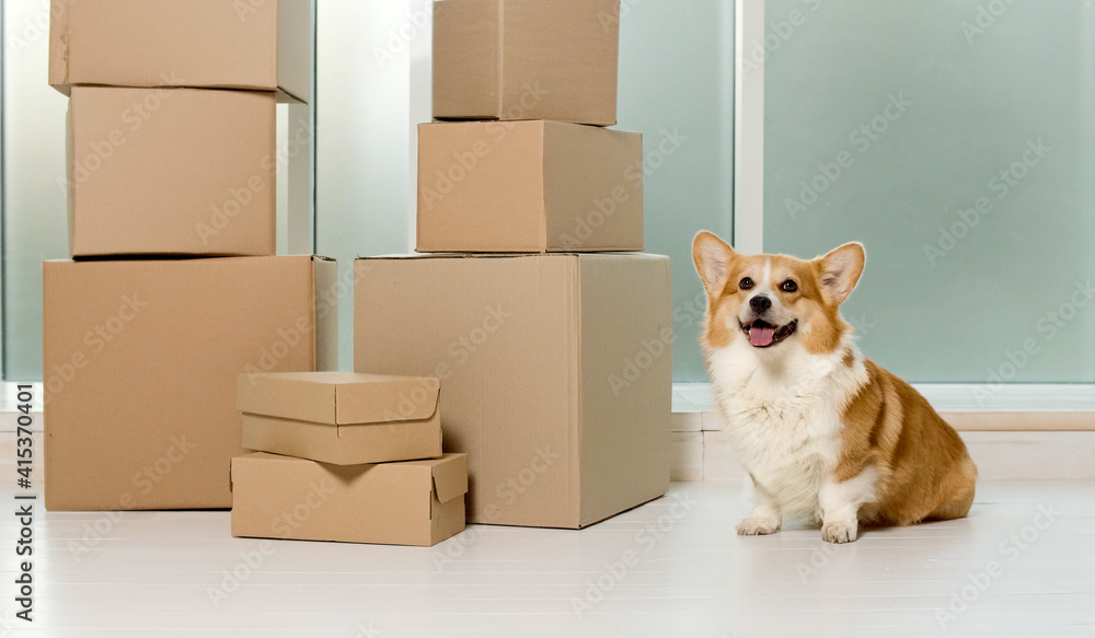 A Cute Dog Sitting Near the Big Boxes. The Relief of Life by the Help of New Technologies With Online Shopping. A Quick Delivery. A Delivery of Orders From Online Shops. Buying by the Internet.