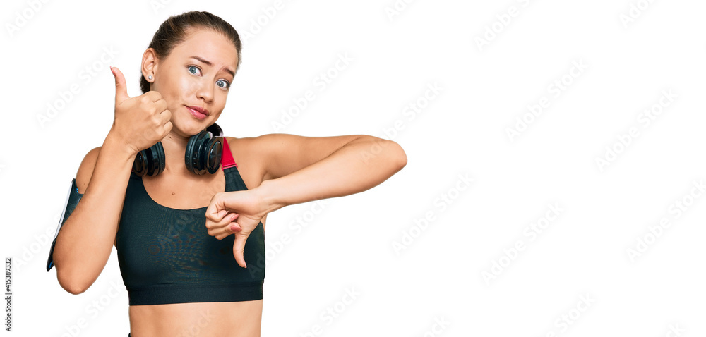 Beautiful blonde woman wearing gym clothes and using headphones doing thumbs up and down, disagreement and agreement expression. crazy conflict