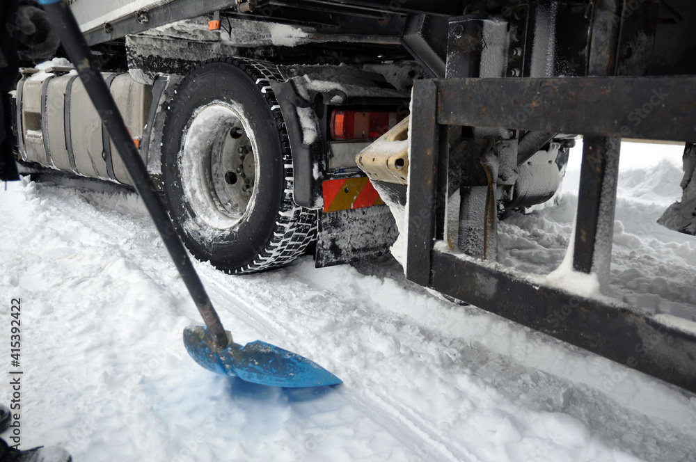 A heavy car got stuck in the snow on the road. Dig it out when looking for a shovel.