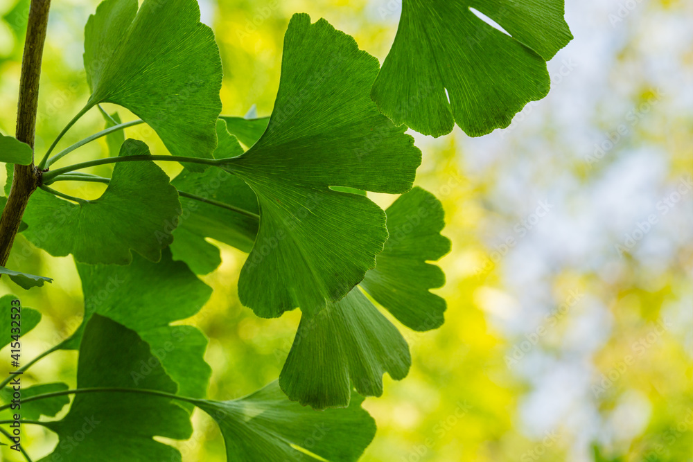 Ginkgo tree (Ginkgo biloba) or gingko with brightly green leaves against background of blurry yellow foliage. Selective close-up. Fresh wallpaper nature concept. Place for your text