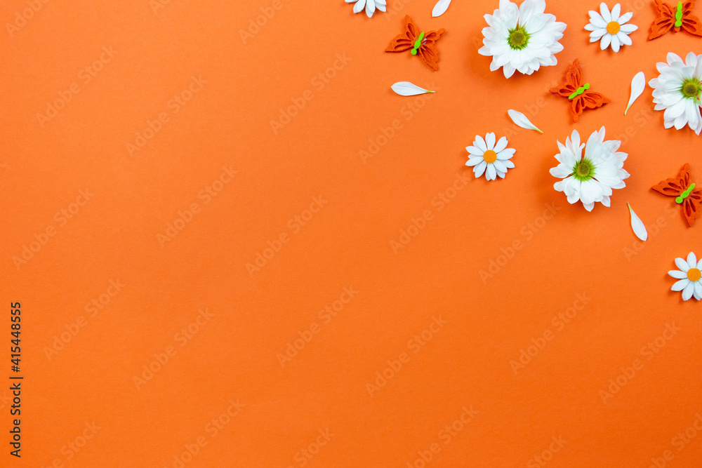 Spring flat lay background with white flowers and butterflies on colorful orange background. Traditional springtime decoration. Top view. Copy space.