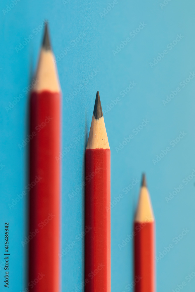 Lápices rojos sobre fondo celeste en fila. Con desenfoque. Conceptual.