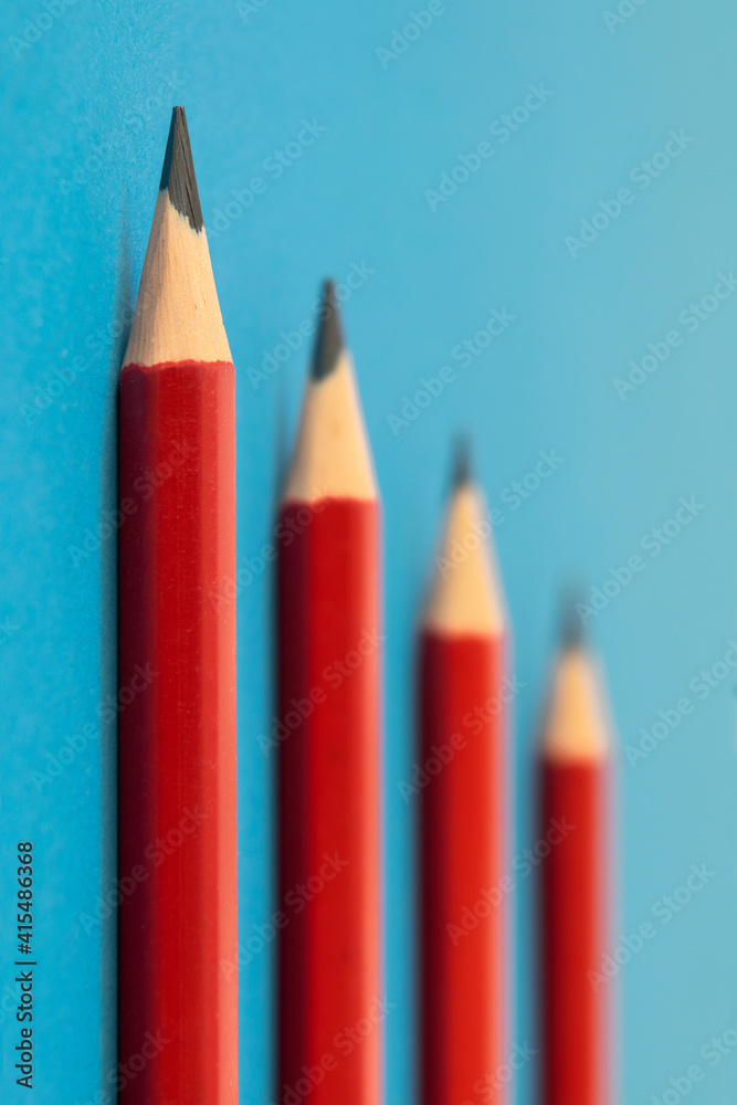 Lápices rojos sobre fondo celeste en fila. Con desenfoque. Conceptual.