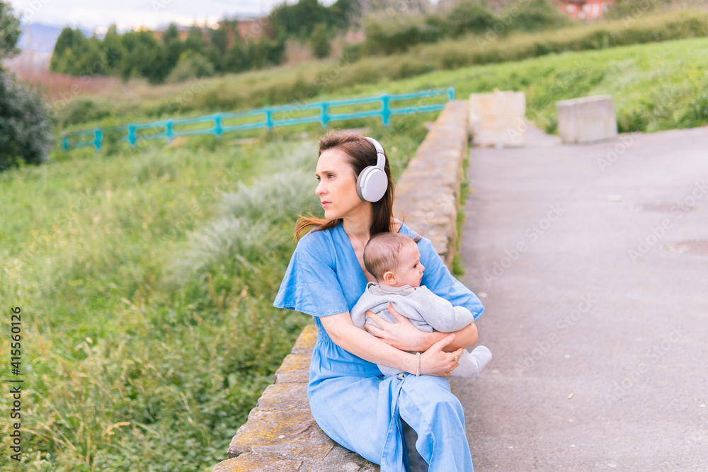 beautiful young middle-aged woman with music headphones and blue dress holding her six-month-old baby in spring in in the countryside. fashion concept