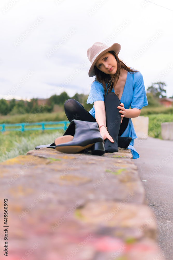 Middle-aged young beautiful woman in blue dress hat and high leather boots removed with sore feet in a countryside area massaging her feet. fashion concept
